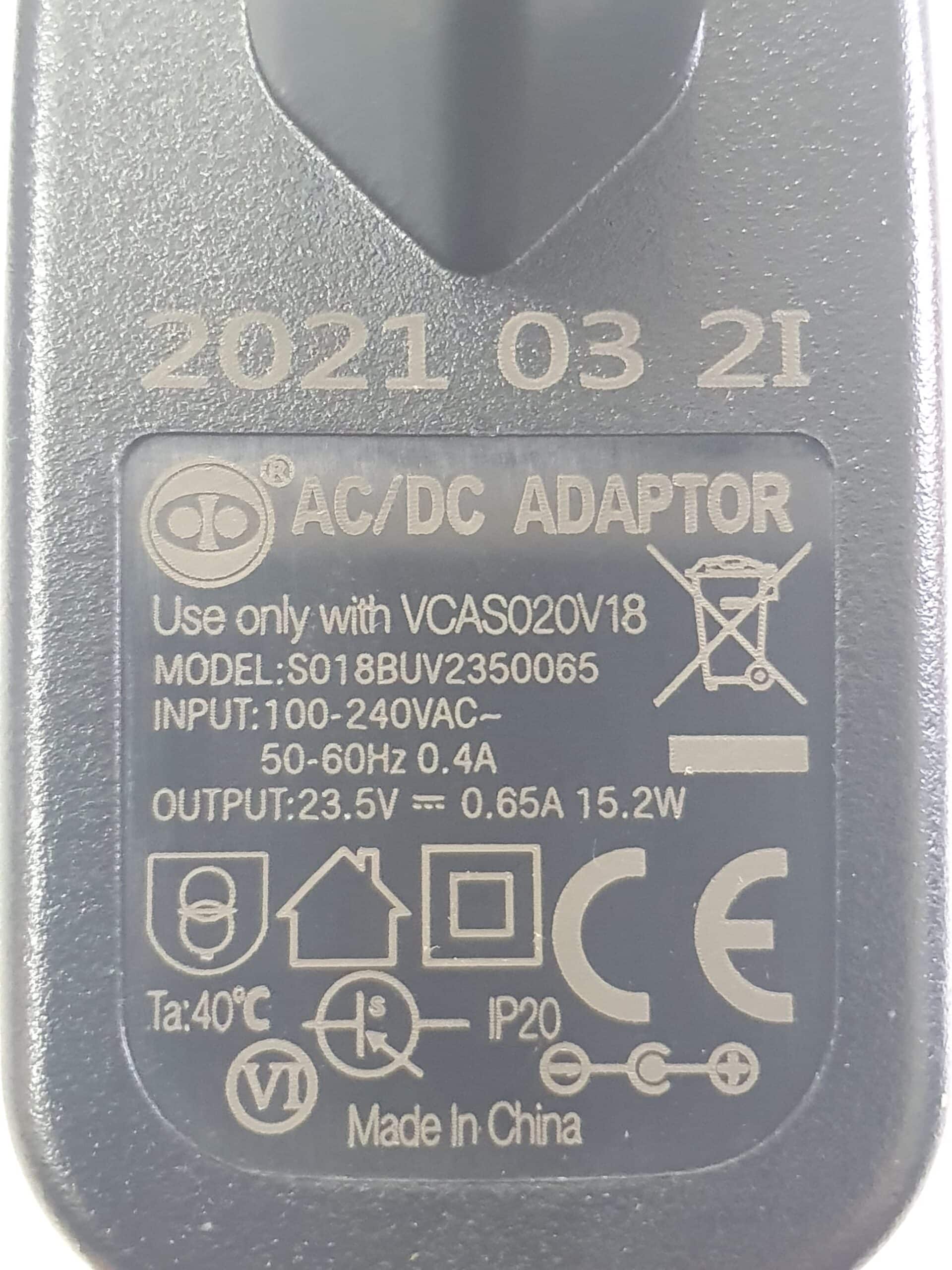 Use only with VCAS020V18 MODEL:S018BUV2350065 INPUT:100-240VAC- 50-60Hz 0.4A OUTPUT:23.5V 0.65A 15.2W
